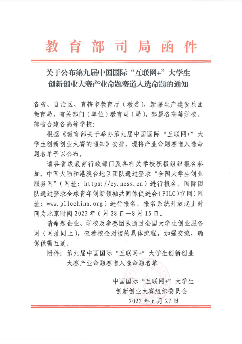 2023年6月28日,中国国际“互联网+”大学生创新创业大赛组委会正式发布了《关于公布第九届中国国际“互联网+”大学生创新创业大赛产业命题赛道入选命题的通知》,百度共有五十七道命题成功入围产业赛道,入围数居全国前列。